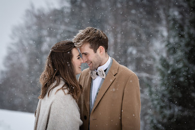 Wir lieben die Außenaufnahmen bei diesem Styled Shoot. Wenn Braut und Bräutigam eins werden mit der Umgebung. Dieser Kontrast zwischen wilder Natur und Schneesturm einerseits und der Romantik und Eleganz andererseits macht das Besondere an einer Schneehochzeit aus. Es müssen nicht zwingend der blaue Himmel und die strahlende Sonne sein, um einzigartige Bilder einzufangen. Das klassische Brautkleid in A-Linie von Bianco Evento aus der Bridal Boutique Freundentränen und der Hochzeitsanzug von Adlmaier in hellem Grau passen perfekt in dieses Szenario. Ein Tipp am Rande: Solltet ihr euer Hochzeits-Outfit noch nicht gefunden haben, schaut gerne mal in unserem Wahnbüchlein vorbei.
